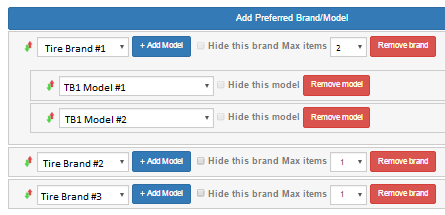 As you can see we’ve added three (3) brands to the Preferred Tires List. Whenever these tires are found in our search results, they will be sorted to the very top. Furthermore, you’ll notice that we’ve set the Max Items field for Tire Brand #1 to 2. Setting this field means that the platform will try to find two (2) matches for Tire Brand #1 before it looks for Tire Brand #2. Finally, I’ve also added two individual models under Tire Brand #1. Doing this means that the system will only add those specific tire models in the first two spots as long as they are found in the search results list. If they are not found, then the system will look for the next Preferred Brand in the list (Tire Brand #2). Note: You can change the order of Preferred Brands/Tires by using your mouse to drag their boxes up/down in the list.
